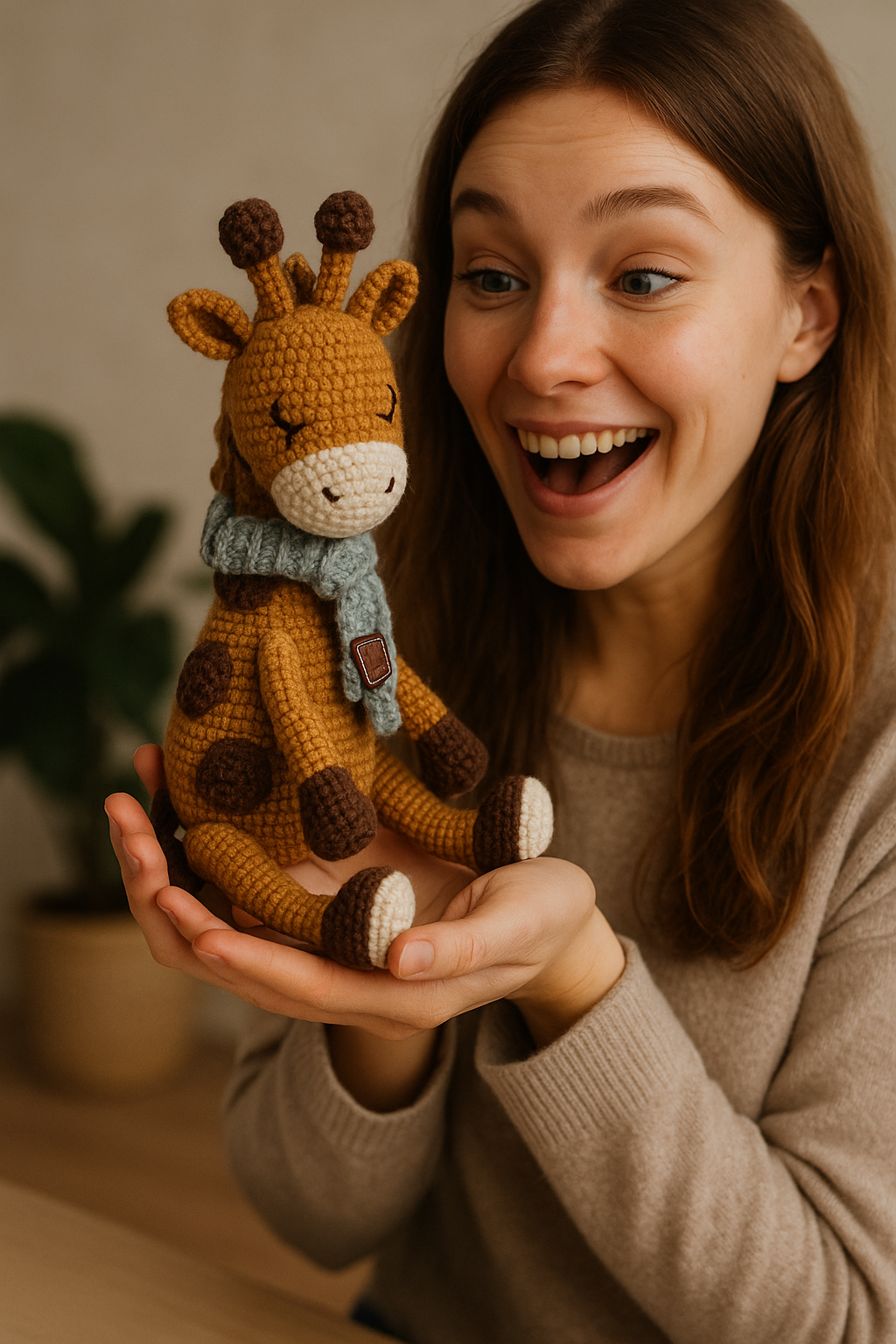 Size: The finished giraffe measures approximately 30–32 cm (12–12.5 inches) tall when made using YarnArt Jeans yarn and a 2.0 mm crochet hook, as recommended in the pattern.