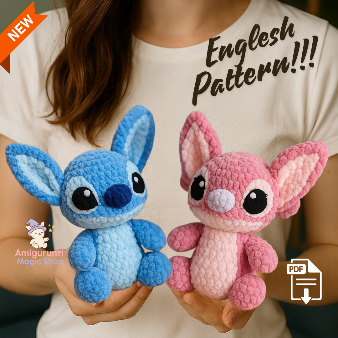 Stich and Angel Amigurumi Crochet Pattern PDF – Soft Plush Toy Set with Big Ears, Cute Blue and Pink Alien Dolls, English Pattern Download